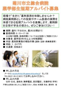 菊川市立総合病院では、病院薬剤師としての役割やチーム医療の実際を体験できる短期アルバイトを募集しています。