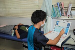 ペースメーカ外来では、ワンドと呼ばれる機器を患者さまの衣類の上からペースメーカ埋め込み部に当て、臨床工学技士がプログラマを操作し検査をします。患者さまの自己脈がどのくらい出現するか、ペースメーカが自己脈を検知できているか(波高値測定)、ペースメーカから出力される刺激の強さは適切か(閾値測定)、電池残量、リード抵抗値等を踏まえ、患者さまに適切な設定をさせていただきます。